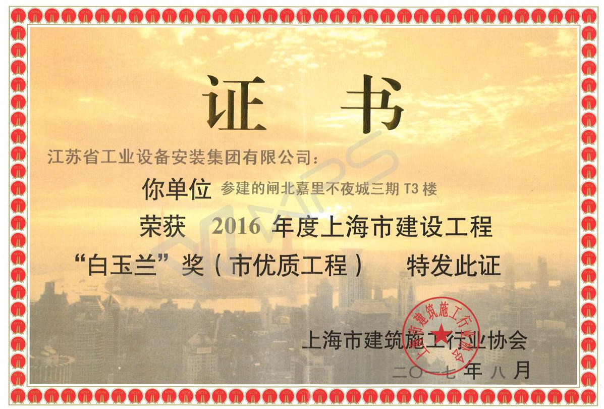 2016年12月,江蘇省工業(yè)設備安裝集團有限公司通旺分公司參建的上海閘北嘉里不夜城三期T3樓項目成功入選上海市建設工程“白玉蘭”獎(市優(yōu)質(zhì)工程),該工程經(jīng)過一冬一夏的使用考驗,無質(zhì)量問題,2017年8月正式頒獎予以表彰。